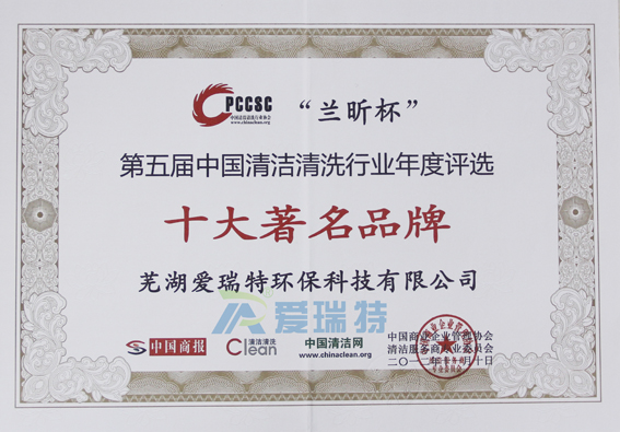 金秋颯爽,碩果累累,由中國商報、中國清潔網(wǎng)、中國商業(yè)企業(yè)管理協(xié)會、清潔服務(wù)商專業(yè)委員會舉行的“蘭昕懷”第五屆中國清潔清洗行業(yè)年度評選活動中,蕪湖愛瑞特環(huán)保科技有限公司被評為“十大著名品.