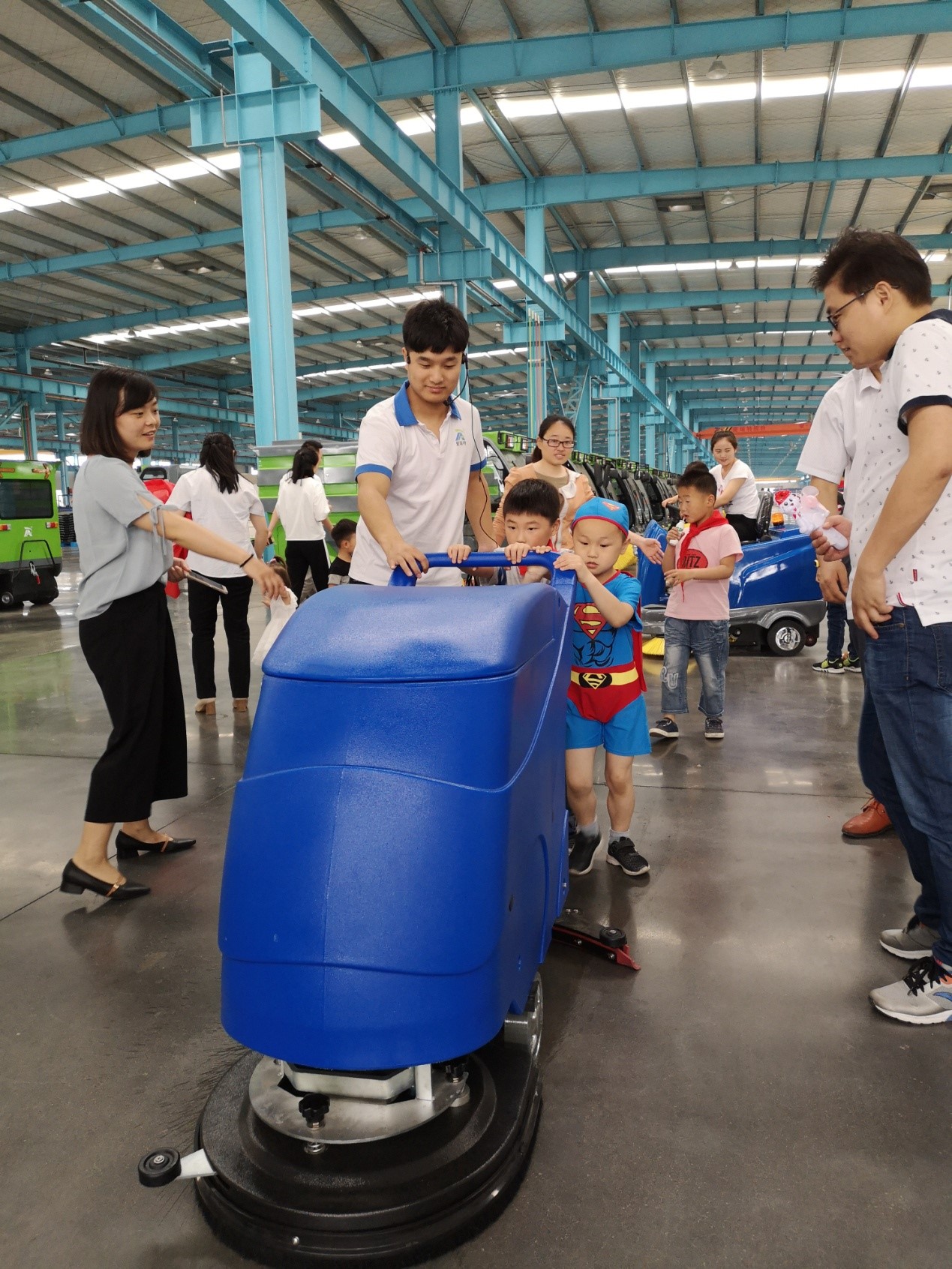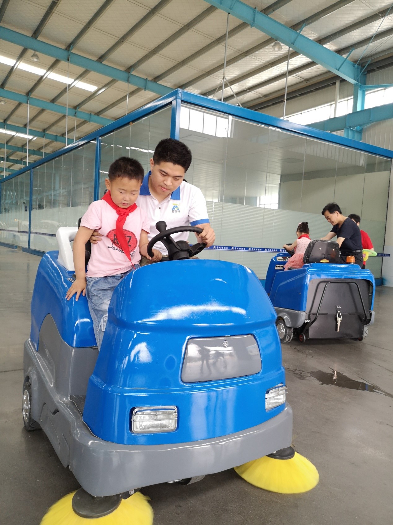 寶貝們開著爸爸媽媽設計制造的掃地車、洗地機,感到了無比的自豪和興奮,